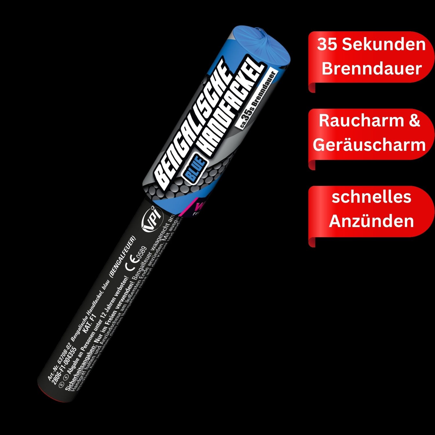 Die Bengalische Handfackel erfüllt die gesetzlichen Anforderungen der Kategorie F2 und darf von Personen ab 16 Jahren verwendet werden. Bitte ausschließlich im Freien nutzen und die Sicherheitsanweisungen des Herstellers beachten.